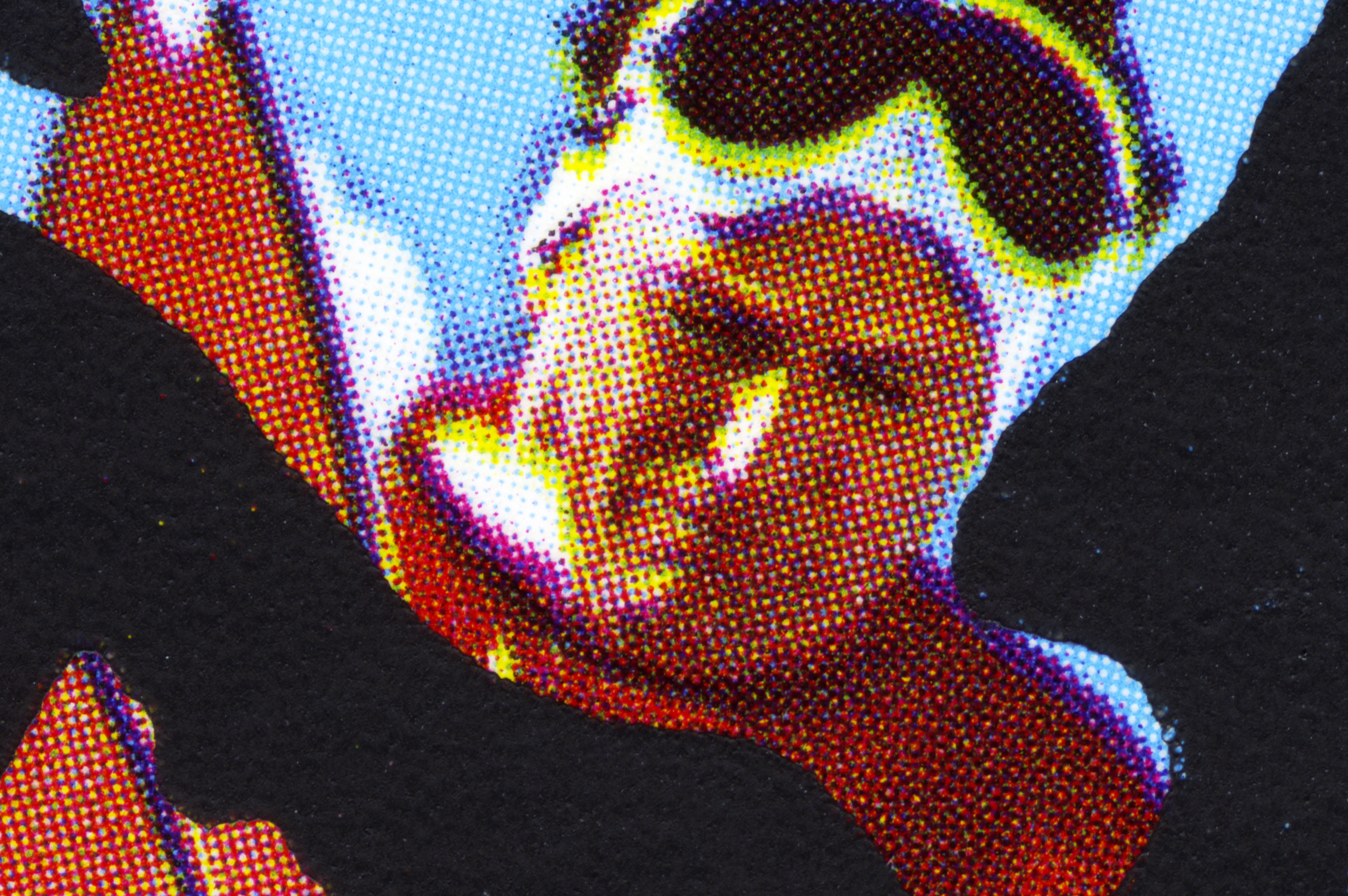 Mais lorsqu’on s’approche des impressions, on remarque la superposition sérigraphique analogue qui, à la manière d’un graffiti (ou même d’un tag), change le message et la texture visuelle du substrat de base. Cette texture visuelle se trouve à être la trame d’impression de la carte postale, maintenant magnifiée à plus de 10 fois sa taille originale.
